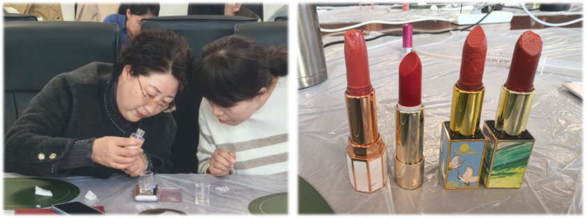 活动伊始,学院书记贺海明同志向女教职工们送上了诚挚的节日祝福,肯定了大家在教学、科研和学院发展中所做出的贡献。随后,专业美妆老师为大家详细讲解了口红的制作原理、原料成分以及不同色系口红与肤色、妆容的搭配技巧。从基础的油脂、蜡质到天然色素的选择,老师的讲解生动有趣,让学院教师们深入了解了小小一支口红背后的奥秘。